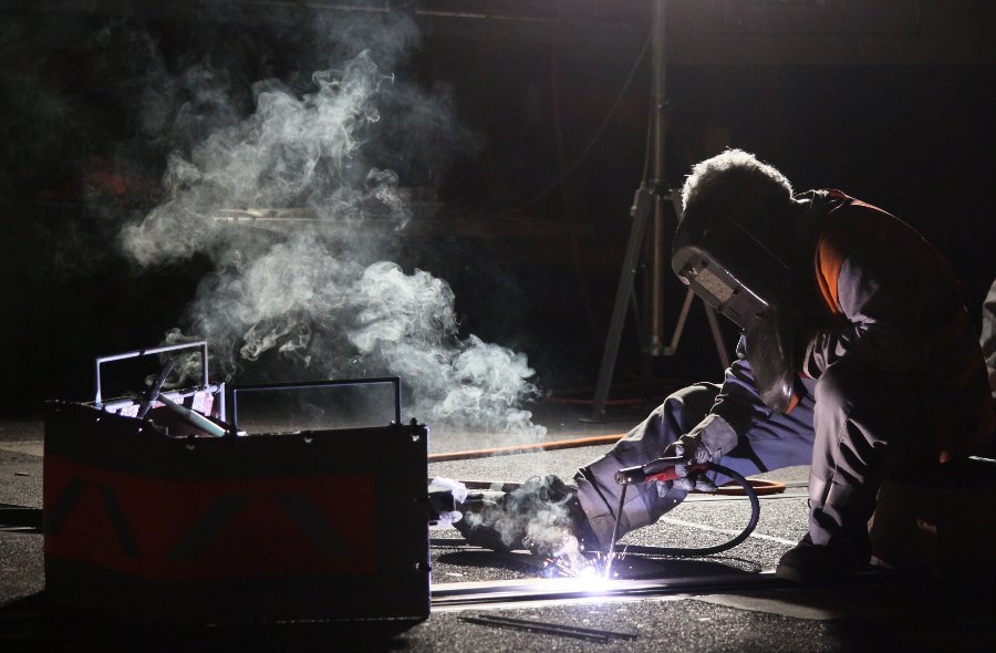 Ein Arbeiter in der Nacht bei der Pflege einer Straßenbahnschiene: